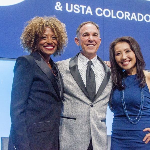 - The Dynamic Trio: USTA Colorado Board Treasurer Angela Finan with Emcees Andy Zodin and Christine Chang Gillette
