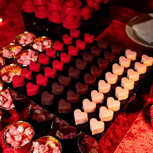 The intimate, boudoir-inspired, winter wonderland began with a set from New York–based DJ and producer Dylan Rhee. Guests leaned into the scene, fueled by a steady flow of champagne, cocktails, caviar, and Valentine’s-themed sweets.