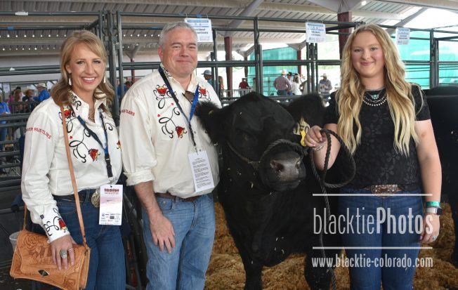 Anneliese Phippen and Tim Miller chat with Reece Elwood and her steer "Timmy"