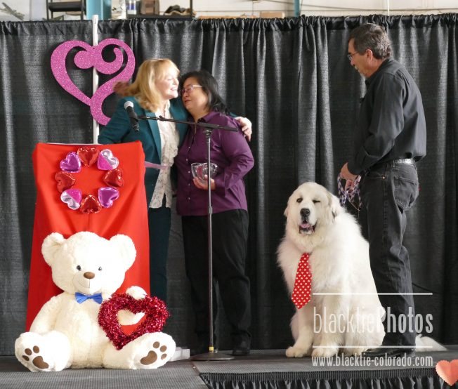 Marilee and Ben Doud, with Sarge, give Pam King from Chewy's Bonetique the Paws of Praise Award