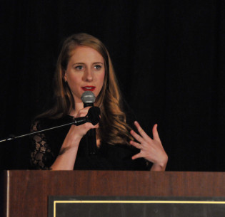 - Event Co-Chair Sharon Schonhaut gets ready to present the Distinguished Corporate Leader Award
